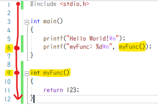 C言語では 9行目の myFunc 関数の定義だけでは駄目なのです。