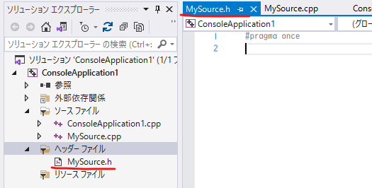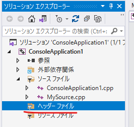 [ヘッダー ファイル] 項目配下に "MySource.h" が追加されたことを確認する