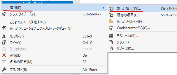 [ソリューション エクスプローラー] の [ヘッダー ファイル] を右クリックする