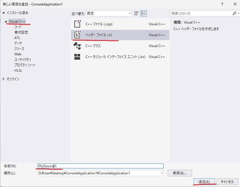 [Visual C++] > [ヘッダー ファイル (.h)] を押下する