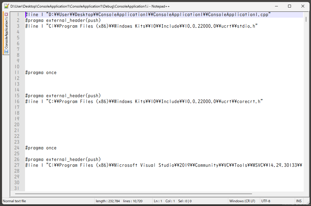 これらの処理を一通り見ていく上で、このページではまず .i ファイルというプリプロセス処理後のテキストファイルを出力する手順について説明します。
