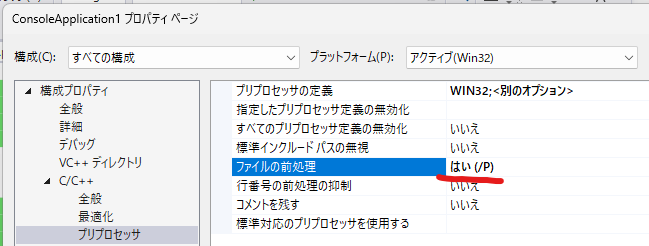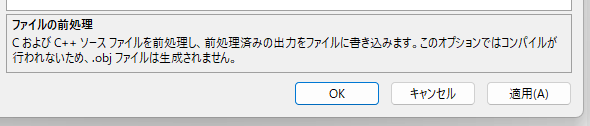 なお、本来 "コンパイル" メニューは、リンクを行わずに .obj ファイルを生成する際に使用します。今回は [ファイルの前処理] : "はい (/P)" を指定しているため、結果的に .obj ファイルが生成されません。