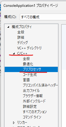 ダイアログ左側、[C/C++] > [プリプロセッサ] とクリックします