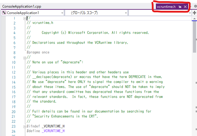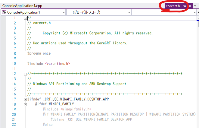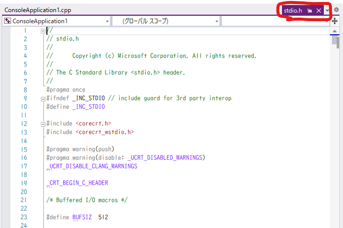 上記で強調された箇所こそ、「#include <...>」行によるヘッダーファイルの取り込みを示す箇所です。
