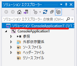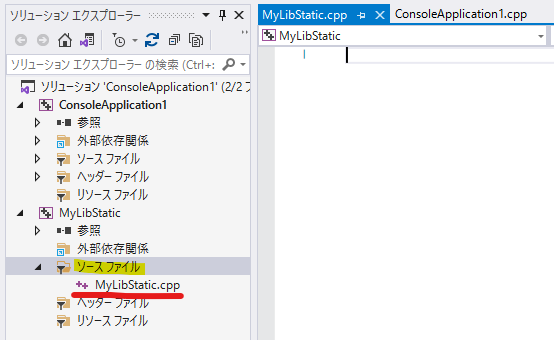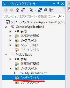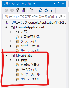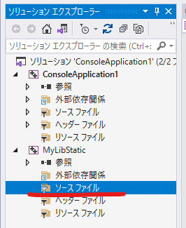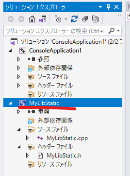 ソリューションとは、複数のプロジェクトを管理するための枠組みです。今回、ソリューション "ConsoleApplication1" にプロジェクト "MyLibStatic" を追加しました。