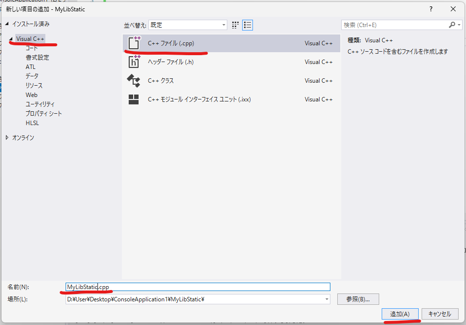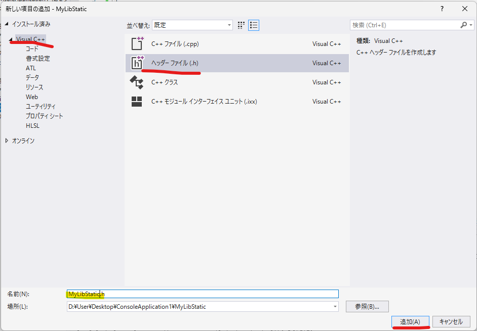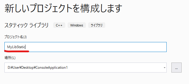 [プロジェクト名] に "MyLibStatic" と入力します