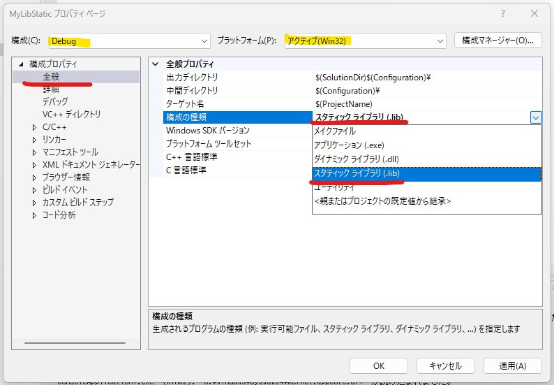 - スタティックライブラリ (.lib) を静的リンク