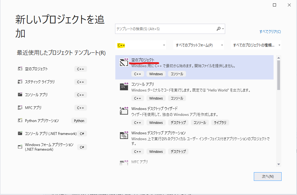 "C++" が選択されていることを確認します。一番上にある "空のプロジェクト" を選択します
